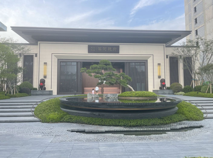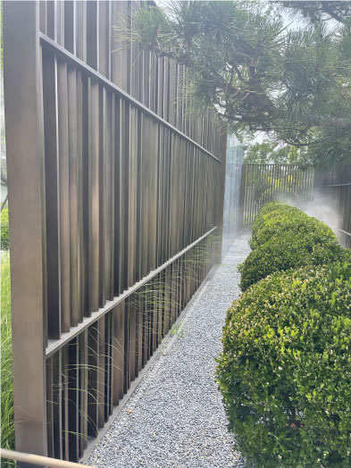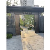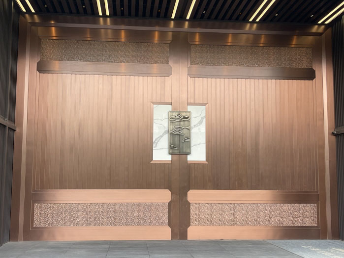 大門整體設(shè)計融合了現(xiàn)代與傳統(tǒng)元素,古銅色的不銹鋼與云紋裝飾性金屬扣相呼應(yīng),現(xiàn)代的不銹鋼材料與古典的設(shè)計花紋相互碰撞,彰顯出高貴典雅的氣質(zhì)。